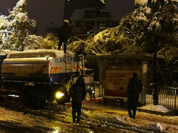 分公司在做好自身除雪救災(zāi)工作的同時(shí),積極調(diào)配資源,參加到合肥市區(qū)公交站臺積雪清掃工作。從4日上午10:00開始,分公司集結(jié)300多人,調(diào)配裝載機(jī)、灑水車等各類機(jī)械設(shè)備20多臺,與積雪比速度,清掃持續(xù)到5日凌晨4:00左右,共清掃了40多座公交站臺。