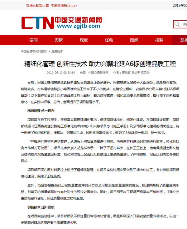 近日,中國交通新聞網(wǎng)以《精細化管理 創(chuàng)新性技術 助力興贛北延A6標創(chuàng)建品質工程》為題,對公司承建的江西興贛北延A6標項目建設進行了專題報道。