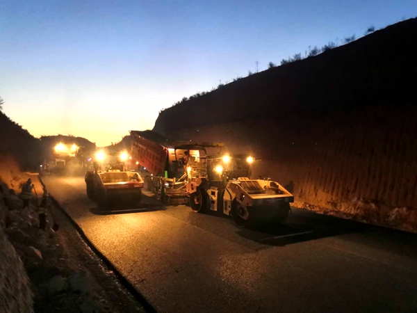 項目全長34.6公里,途徑四個鄉(xiāng)鎮(zhèn),在完成路基施工后,根據(jù)交驗時間分段進入路面攤鋪。立足實際情況,項目充分發(fā)揮主觀能動性,尋找一切可利用的工作面,精心策劃、見縫插針組織路面施工。在率先完成一工區(qū)水穩(wěn)、瀝青攤鋪施工任務(wù)后,迅速組織精干力量,轉(zhuǎn)戰(zhàn)一二工區(qū)連接部分?jǐn)備伿┕?,僅用20余天打通了兩個工區(qū)的運輸通道。