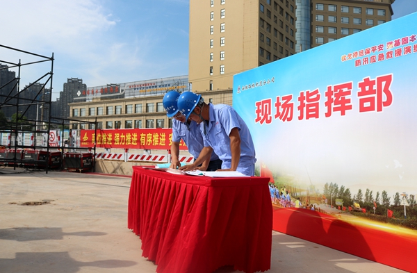 此次演練背景為多日連續(xù)降雨造成施工現(xiàn)場基坑積水,嚴(yán)重影響基坑穩(wěn)定和施工人員人身安全。在積水超過警戒水位后,項目部應(yīng)急救援領(lǐng)導(dǎo)小組立即啟動應(yīng)急預(yù)案,開展應(yīng)急救援工作。演練按預(yù)警報告、集合分工、基坑監(jiān)測、筑壩攔水、快速排水、醫(yī)療救助和匯報總結(jié)等流程進(jìn)行。參演人員分成警戒保衛(wèi)、醫(yī)療救護(hù)、技術(shù)指導(dǎo)、物資供應(yīng)、現(xiàn)場搶險五個小組,按照預(yù)案,提前演練、各司其職、密切配合,確保了防汛應(yīng)急救援演練活動順利完成。