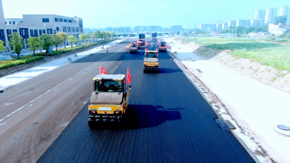 5月3日,在霍邱縣蓼東大道施工現(xiàn)場,工人們正進(jìn)行安陽山路至五岳路段下面層瀝青攤鋪工作,一輛輛運料車、攤鋪機、壓路機來回穿梭。