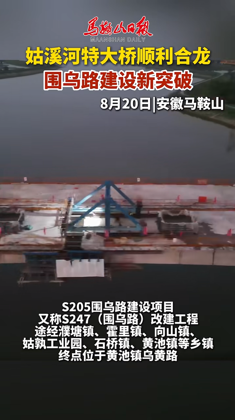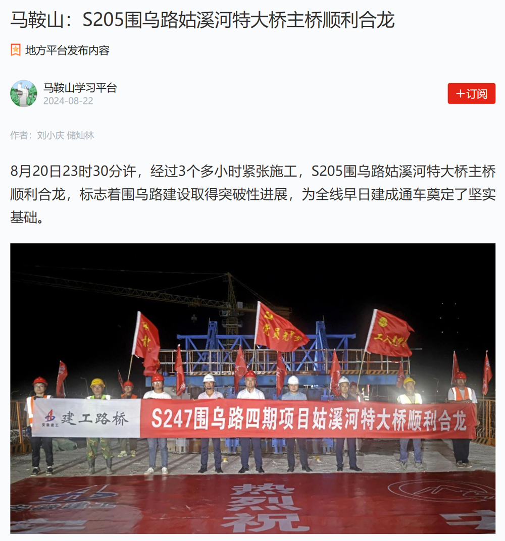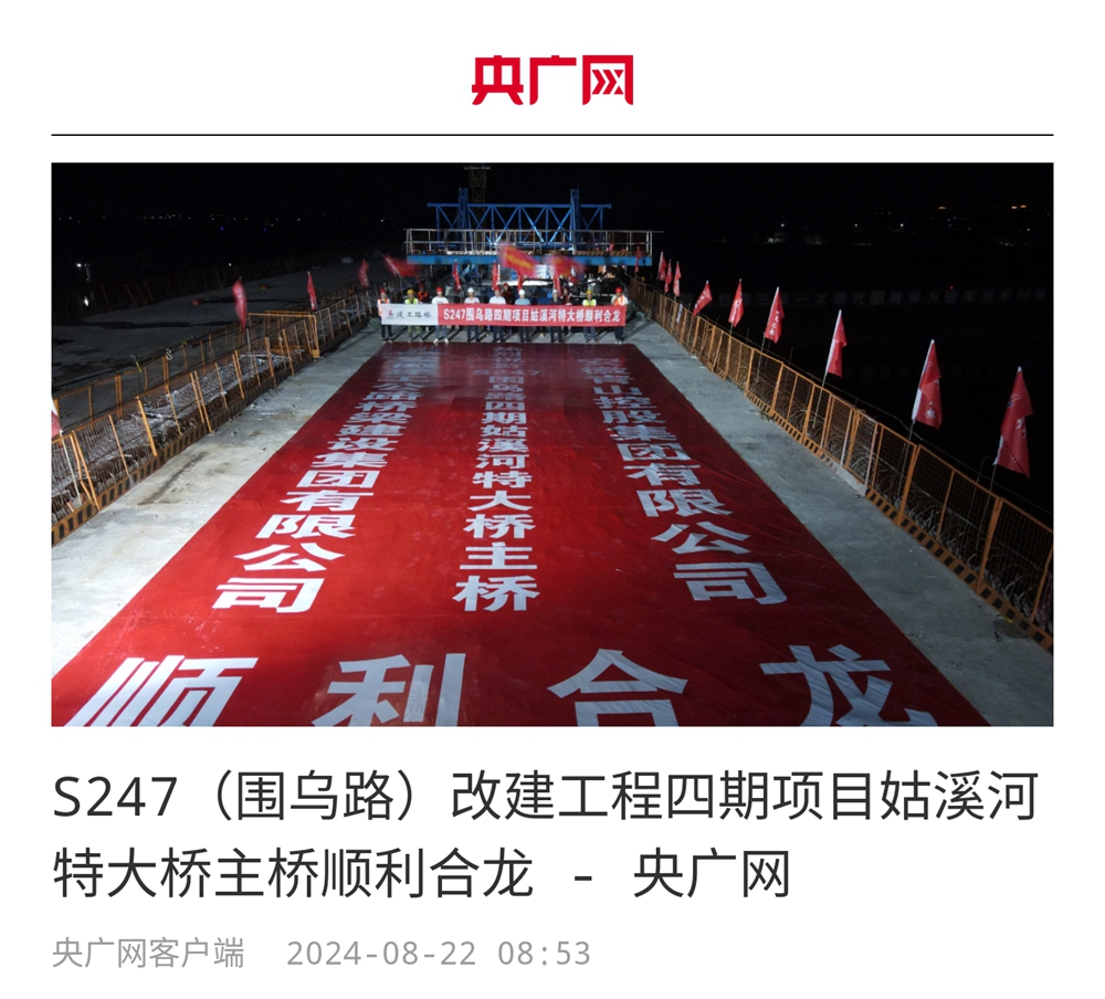 【名媒聚焦】央廣網、學習強國等主流媒體聚焦S247(圍烏路)改建工程四期姑溪河特大橋主橋順利合龍