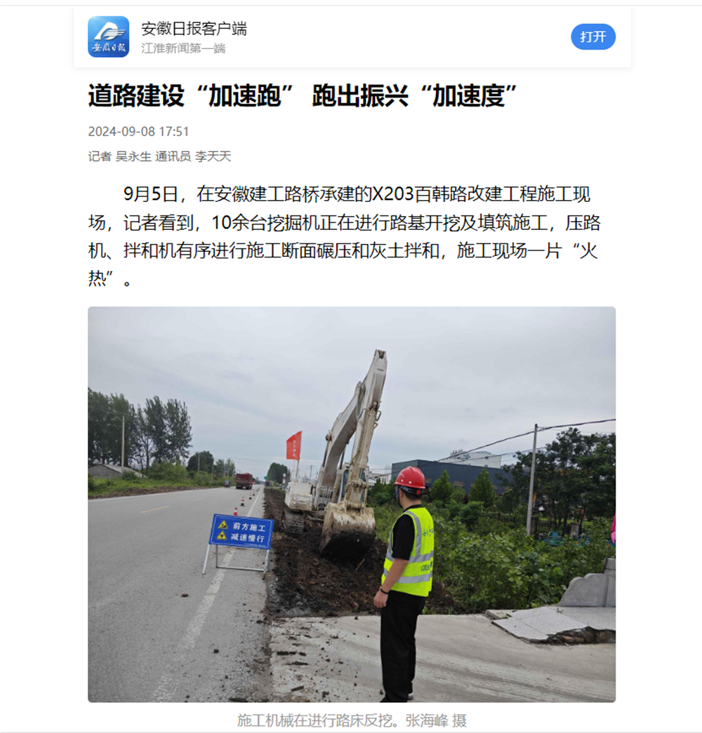 【名媒聚焦】安徽日報客戶端:X203百韓路改建工程——道路建設“加速跑” 跑出振興“加速度”