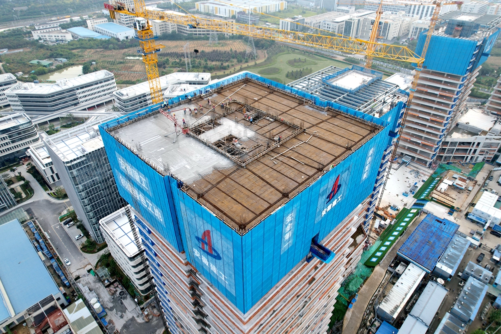 自二期建設(shè)以來,項(xiàng)目集中優(yōu)勢資源高效推進(jìn)主體結(jié)構(gòu)施工。此次完成封頂?shù)腁4#樓單體,建筑面積約37000平方米,地上建筑22層,建筑高度95.3米。建成后將成為集高端企業(yè)總部、星級酒店、辦公樓、商業(yè)會(huì)議中心等功能為一體的現(xiàn)代化辦公聚合體。