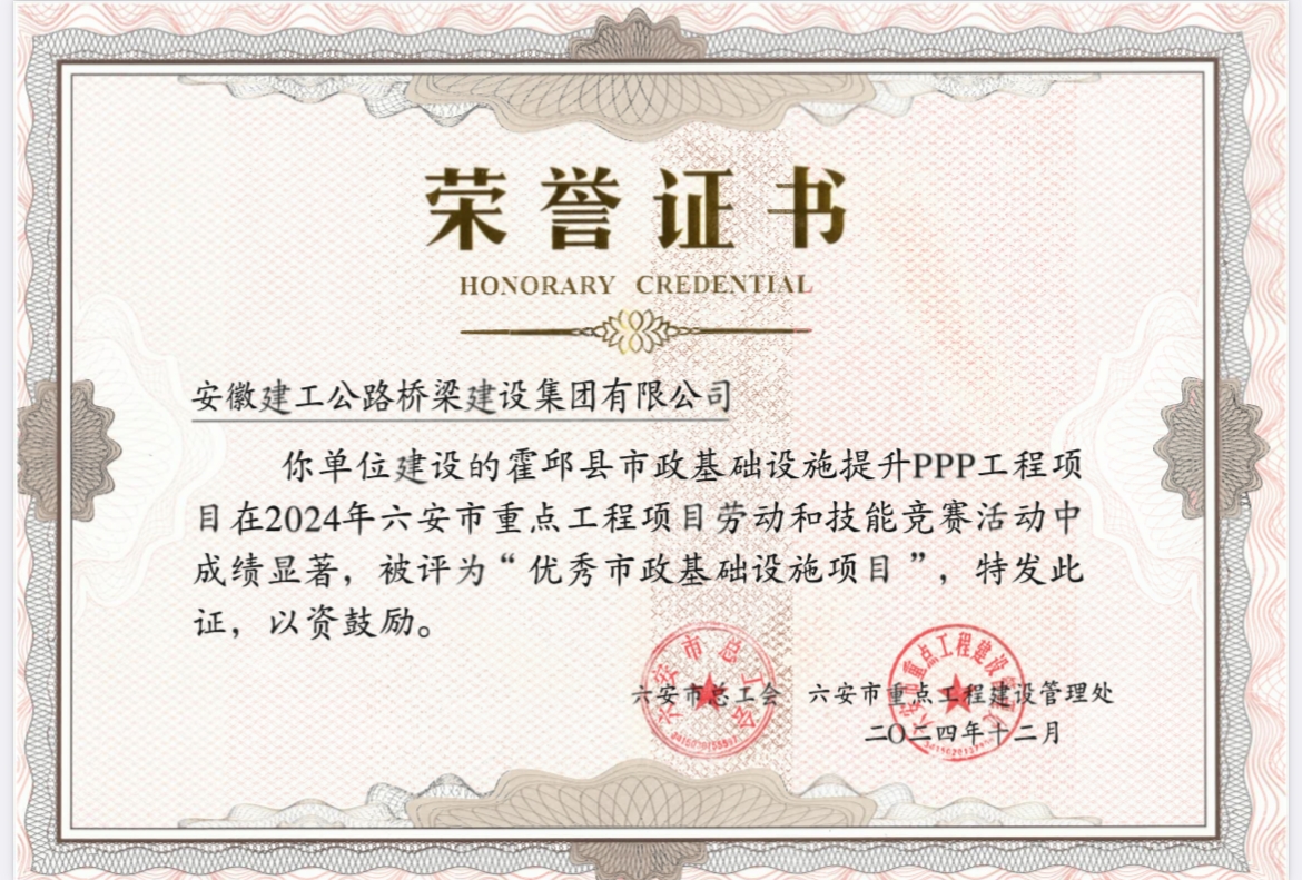 近日,“建功新時(shí)代 奮進(jìn)新征程”2024年六安市重點(diǎn)工程項(xiàng)目勞動(dòng)和技能競(jìng)賽成果公布,霍邱PPP項(xiàng)目榮獲“優(yōu)秀市政基礎(chǔ)設(shè)施項(xiàng)目”榮譽(yù)稱號(hào)。
