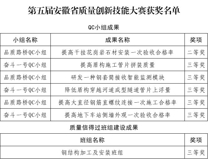 近日,第五屆安徽省質(zhì)量創(chuàng)新技能大賽獲獎名單公布,公司申報的QC小組成果獲得二等獎1項,三等獎5項,申報的質(zhì)量信得過班組建設(shè)成果獲得三等獎1項。