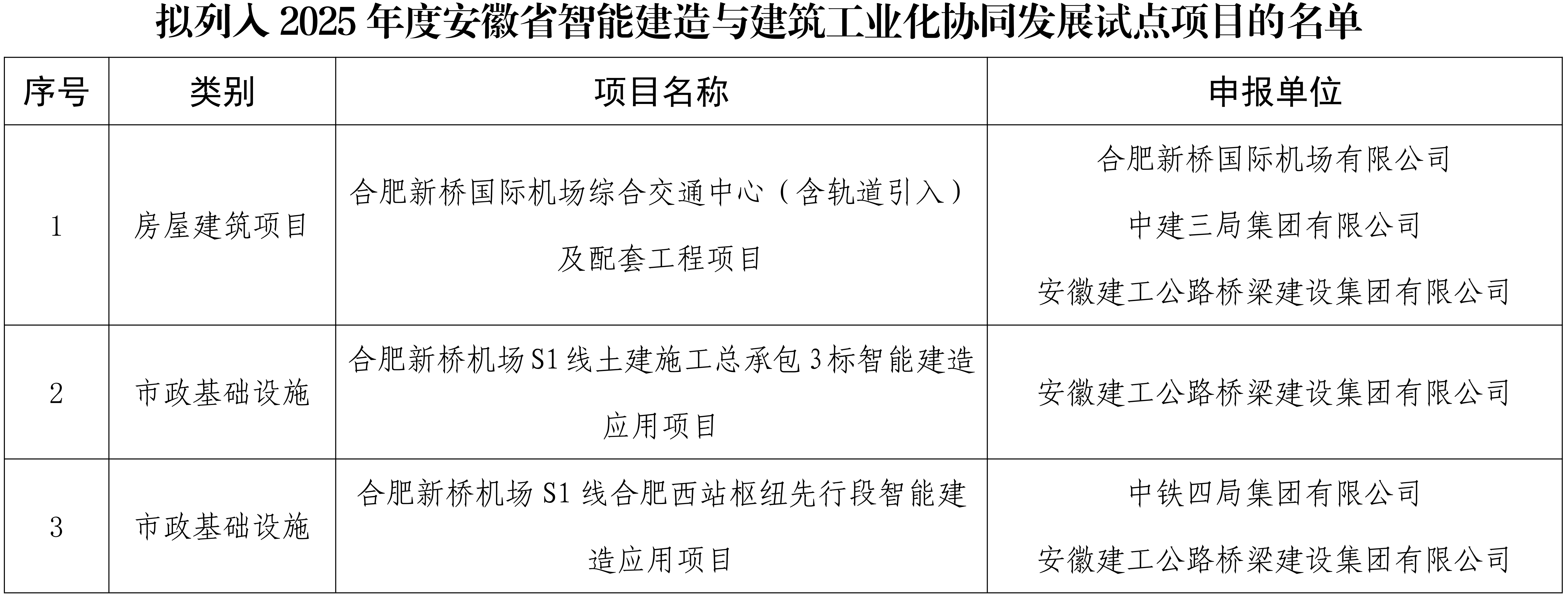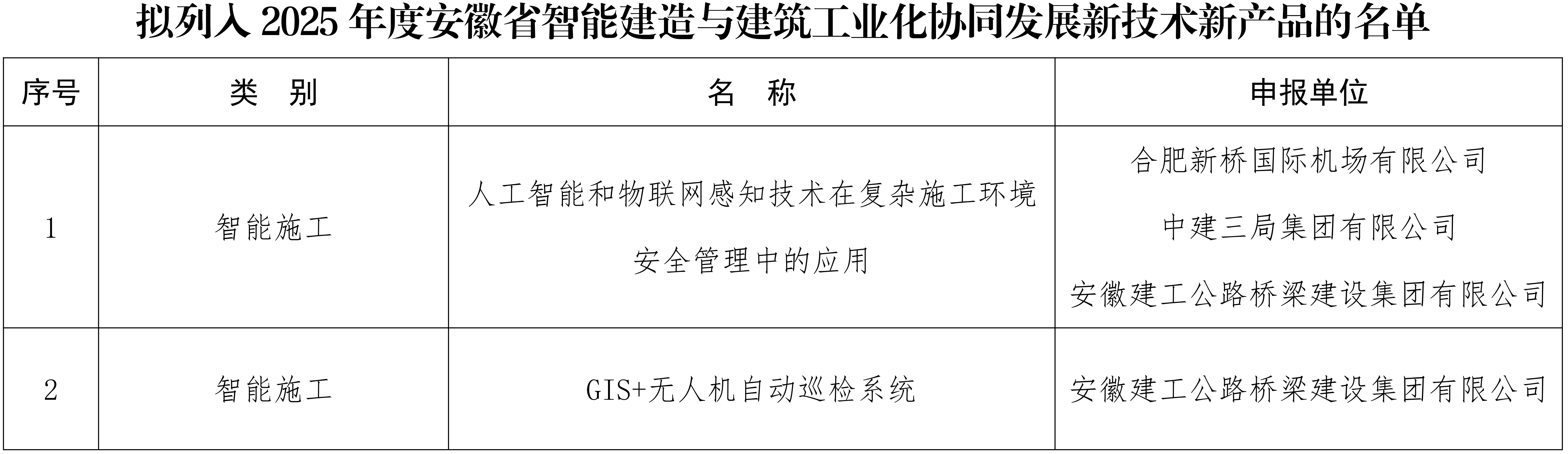近日,安徽省住房和城鄉(xiāng)建設(shè)廳公布了2025年度安徽省智能建造與建筑工業(yè)化協(xié)同發(fā)展新技術(shù)新產(chǎn)品及試點(diǎn)項(xiàng)目,公司“新橋機(jī)場S1線土建施工總承包3標(biāo)”、“新橋機(jī)場S1線合肥西站樞紐先行段”、“合肥新橋國際機(jī)場綜合交通中心(含軌道引入)及配套工程”三個(gè)項(xiàng)目,“人工智能和物聯(lián)網(wǎng)感知技術(shù)在復(fù)雜施工環(huán)境安全管理中的應(yīng)用”、“GIS+無人機(jī)自動(dòng)巡檢系統(tǒng)”等兩項(xiàng)產(chǎn)品應(yīng)用成功入選。