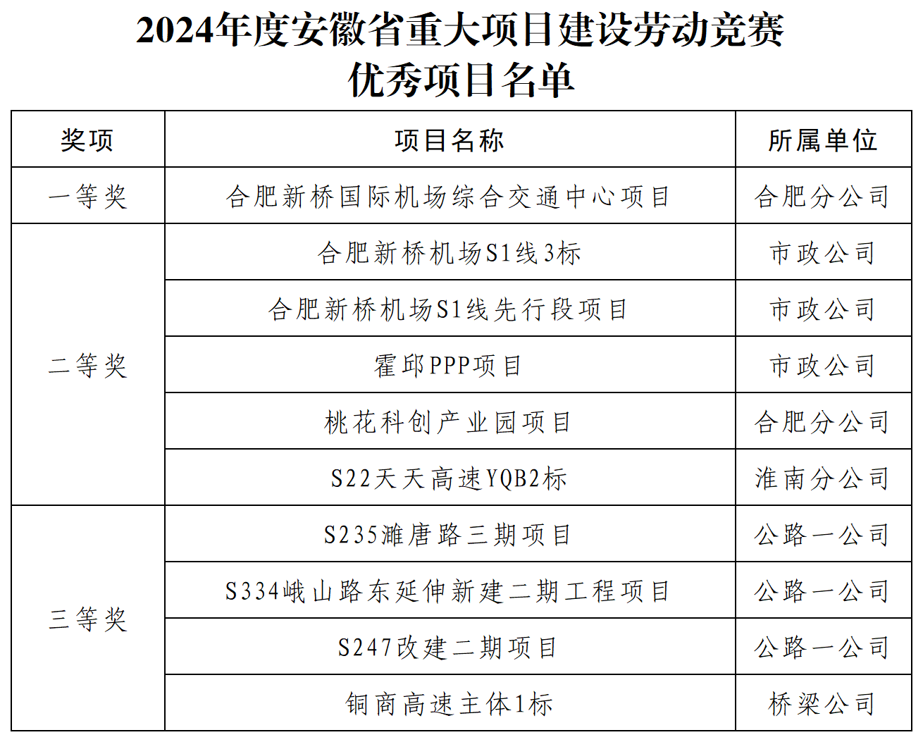 近日,安徽省住建廳與省總工會(huì)對2024年度重大項(xiàng)目建設(shè)勞動(dòng)競賽參賽項(xiàng)目進(jìn)行了通報(bào)表揚(yáng),公司承建的合肥新橋國際機(jī)場綜合交通中心項(xiàng)目、S1線3標(biāo)等10個(gè)項(xiàng)目榮獲優(yōu)秀項(xiàng)目稱號。