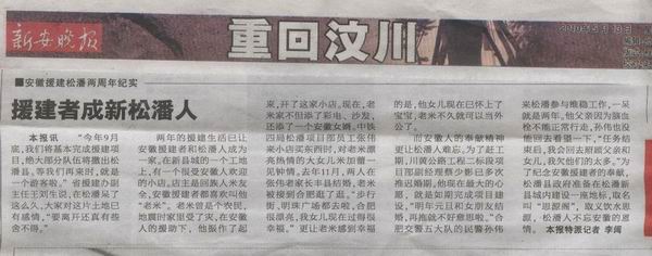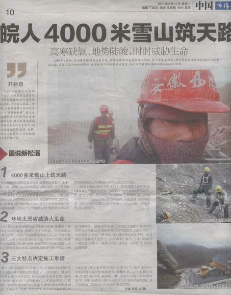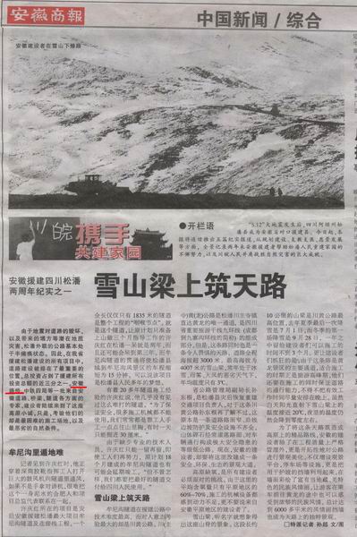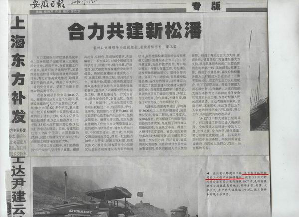 在“5.12”汶川大地震發(fā)生兩周年之際,安徽省路橋公司承建的我省對(duì)口援建四川松潘縣項(xiàng)目之一——漳黃公路道路改建工程02標(biāo)再次引起省內(nèi)各大主流媒體的高度關(guān)注。2010年5月12日《安徽日?qǐng)?bào)》以專版形式發(fā)表了我省對(duì)口支援領(lǐng)導(dǎo)小組副組長(zhǎng)、省政府秘書(shū)長(zhǎng)梁衛(wèi)國(guó)文章《合力共建新松潘》,對(duì)安徽路橋在施工條件和環(huán)境十分艱苦的情況下表現(xiàn)出來(lái)的優(yōu)良政治品格給予了充分肯定。5月11日安徽電視臺(tái)第一時(shí)間欄目記者在海拔4000米以上的施工現(xiàn)場(chǎng)采訪了項(xiàng)目副經(jīng)理蔡少影同志。5月10日《新安晚報(bào)》、《安徽市場(chǎng)報(bào)》等均以??问綀?bào)道了公司援建項(xiàng)目。
