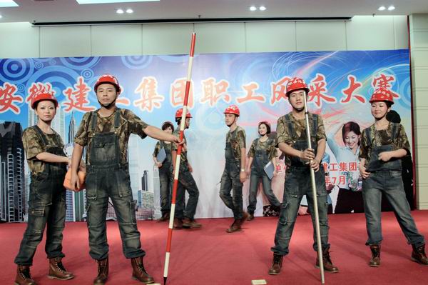 公司12名職工分別展示了三套服裝。第一套職業(yè)裝突破了傳統(tǒng)職業(yè)裝的局限,以背帶牛仔工裝褲為主,別具一格。再搭配安全帽、對(duì)講機(jī)等施工現(xiàn)場(chǎng)道具,將路橋的職業(yè)特性展示的淋漓盡致,在眾多參賽隊(duì)伍中獨(dú)樹一幟。第二套時(shí)裝,由六位女職工身著綴滿亮片的五彩短裙,在輕快動(dòng)感的音樂(lè)下,充分展現(xiàn)了女職工的青春活力。第三套藝術(shù)裝,以晚禮服為主,四位男職工風(fēng)度翩翩,四位女職工婀娜多姿,凸顯了路橋兒女的別樣情懷。