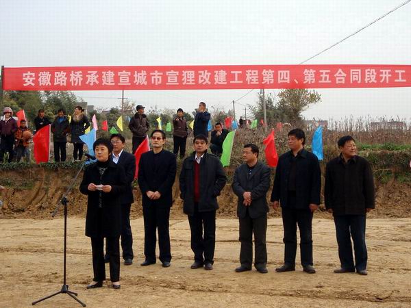 11月28日上午,在宣貍路改建工程第五合同段K34+740施工現(xiàn)場響起了歡快的鞭炮聲,鮮艷的彩旗熱情地歡迎四方賓朋,宣貍路改建工程第四、第五合同段開工儀式隆重舉行。出席儀式的有宣城市交通局總工程師、建委副主任夏志海、宣州區(qū)副區(qū)長傅葵、宣州區(qū)交通局局長胡學(xué)斌、宣州區(qū)宣貍路征遷協(xié)調(diào)組副組長江國平、貍橋鎮(zhèn)書記楊承保、貍橋鎮(zhèn)鎮(zhèn)長時國全、總監(jiān)代表邱旭光、駐地柏玉坤、安徽省路橋公司黨委書記陳光磊、副總經(jīng)理盛明宏以及朱橋和沈村鄉(xiāng)鎮(zhèn)領(lǐng)導(dǎo)、沿線村委會代表、村民代表等相關(guān)人員。