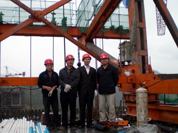 31日上午,在經過整夜大雨后,天空依舊飄散著涼涼的細雨。盛總一行在項目總工胡學祥和項目副經理張林的陪同下,對巖子腳大橋進行了認真的檢查,并冒雨登上高達74米的4號主墩施工現(xiàn)場。他就進行到掛藍施工階段的大橋與項目人員展開討論,對施工現(xiàn)場存在的施工難點和注意事項一一指出。盛總對項目部克服種種困難加緊施工作出了肯定。