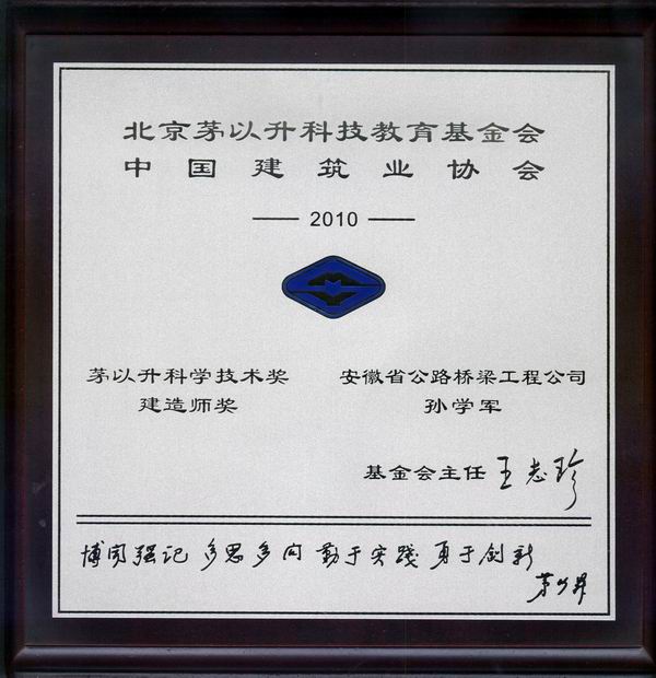 孫學(xué)軍主持建設(shè)了安徽省南照淮河大橋、沿江高速、廬銅高速、銅湯高速、合肥市徽州大道等工程項目,所建項目榮獲了國家優(yōu)質(zhì)獎“魯班獎”、省優(yōu)“黃山杯”等獎項,并獲省交通廳“優(yōu)秀施工單位”、合肥市委市政府“大建設(shè)先進(jìn)集體”等榮譽。此外,他個人榮獲全國優(yōu)秀建造師、“魯班獎”工程優(yōu)秀項目經(jīng)理、“黃山杯”工程優(yōu)秀項目經(jīng)理等榮譽。