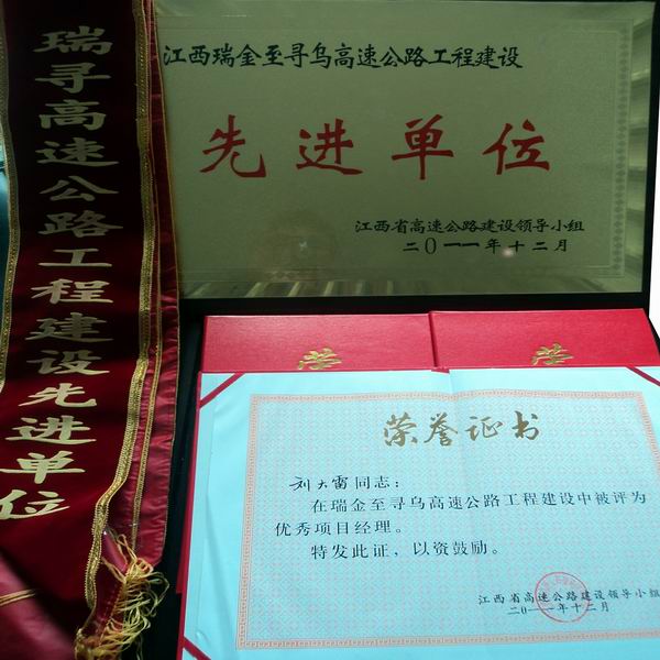 公司承建的瑞尋A7標(biāo)在公司的正確領(lǐng)導(dǎo)下,在以劉大雷同志為首的項(xiàng)目全體員工的共同奮斗下,經(jīng)過(guò)兩年的頑強(qiáng)拼搏、艱苦施工,終于實(shí)現(xiàn)了瑞尋高速公路的建成通車,在贛南大地描繪了一條絢麗的彩虹,書(shū)寫(xiě)了一幅質(zhì)優(yōu)、安全、廉潔、環(huán)保的壯麗畫(huà)卷。瑞尋A7標(biāo)以工程質(zhì)量更優(yōu)、外觀形象更美、生態(tài)環(huán)境更佳、依法管理更嚴(yán)、安全廉潔更好為要求,以抓細(xì)節(jié)、樹(shù)精品、講程序、促規(guī)范、善創(chuàng)新、爭(zhēng)一流為管理理念,取得了一系列的優(yōu)異成績(jī)。在項(xiàng)目辦的兩次階段評(píng)比中均獲得A段第一,全線第二名的好成績(jī),還獲得了業(yè)主頒布的“先進(jìn)單位”稱號(hào),項(xiàng)目經(jīng)理劉大雷獲得了瑞尋項(xiàng)目“優(yōu)秀項(xiàng)目經(jīng)理”稱號(hào),項(xiàng)目總工戴聲慶、副經(jīng)理鳳爾飛、王星輝和黃明明四人獲得了“先進(jìn)個(gè)人”稱號(hào)。