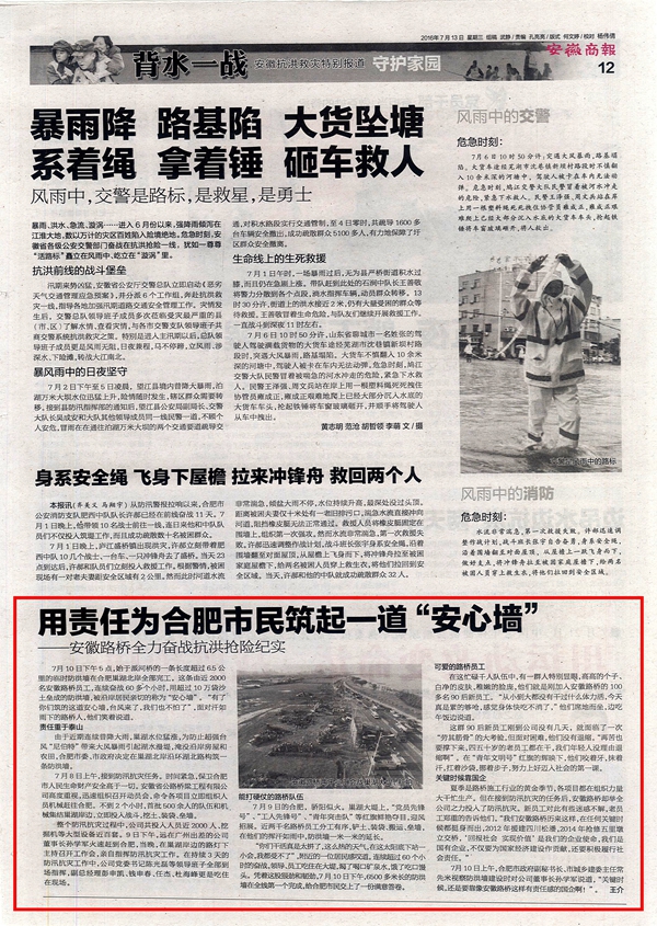 近日,公司積極響應(yīng)合肥市委、市政府號(hào)召,全力參與環(huán)湖大道和十五里河抗洪搶險(xiǎn)的事跡得到社會(huì)的高度關(guān)注。7月12日、13日,中安在線、《安徽商報(bào)》等多家省級(jí)媒體對(duì)公司抗洪搶險(xiǎn)事跡進(jìn)行了連續(xù)報(bào)道。