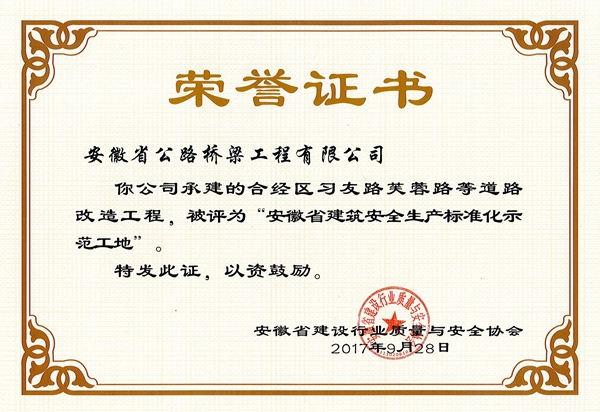 這是公司自去年開全省市政路橋工程先河,一次性獲得五個省級安全標準化示范工地后,再次獲得這一榮譽。