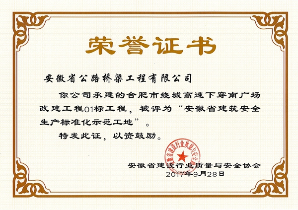 近日,從安徽省建設(shè)行業(yè)質(zhì)量與安全協(xié)會獲悉,由公司承建的合肥市繞城高速下穿南廣場改建工程01標、合經(jīng)區(qū)習(xí)友路芙蓉路等道路改造工程兩個項目榮獲“安徽省建筑安全生產(chǎn)標準化示范工地”稱號。