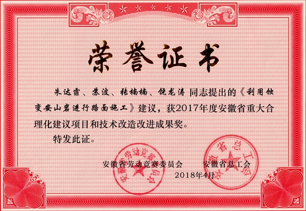 公司14項(xiàng)合理化建議榮獲“安徽省重大合理化建議項(xiàng)目和技術(shù)改造改進(jìn)成果獎(jiǎng)”