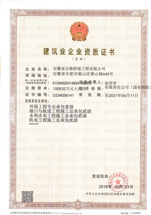 10月23日,公司環(huán)保工程專業(yè)承包壹級、水利水電工程施工總承包貳級、機(jī)電工程施工總承包貳級三項(xiàng)資質(zhì)順利通過安徽省住房和城鄉(xiāng)建設(shè)廳審查核準(zhǔn)。三項(xiàng)新資質(zhì)的取得為公司進(jìn)一步拓展非公路施工業(yè)務(wù),實(shí)現(xiàn)經(jīng)營業(yè)務(wù)多領(lǐng)域發(fā)展打下了基礎(chǔ)。