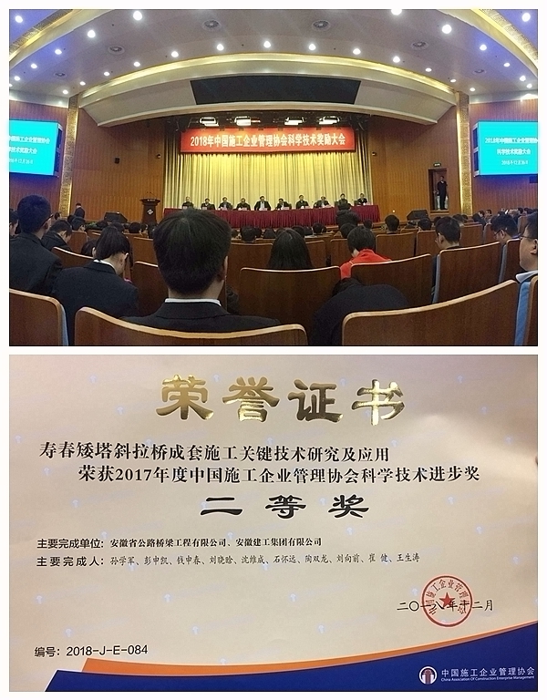 12月26日,“2018年中國(guó)施工企業(yè)管理協(xié)會(huì)科學(xué)技術(shù)獎(jiǎng)勵(lì)大會(huì)” 在北京召開,公司主持的課題成果“壽春矮塔斜拉橋成套施工關(guān)鍵技術(shù)研究及應(yīng)用”經(jīng)過專家評(píng)審,被鑒定為國(guó)際先進(jìn)水平,榮獲二等獎(jiǎng)并接受了表彰。