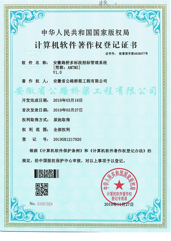 近日,《安徽路橋多標(biāo)段招標(biāo)管理系統(tǒng)V1.0》《安徽路橋關(guān)鍵績(jī)效考核管理系統(tǒng)V1.0》等五項(xiàng)管理系統(tǒng)取得國家版權(quán)局頒發(fā)的計(jì)算機(jī)軟件著作權(quán)。