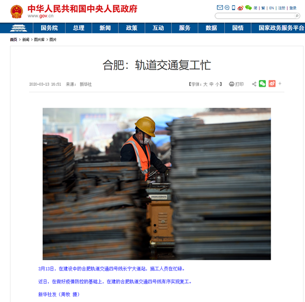 近日,中華人民共和國中央人民政府官方網(wǎng)站、新華社同時(shí)以《合肥軌道交通復(fù)工忙》為題,報(bào)道了公司承建的合肥軌道交通4號(hào)線長寧大道站復(fù)工復(fù)產(chǎn)情況,用8張圖片展現(xiàn)了現(xiàn)場全面復(fù)工復(fù)產(chǎn)后的施工場景。