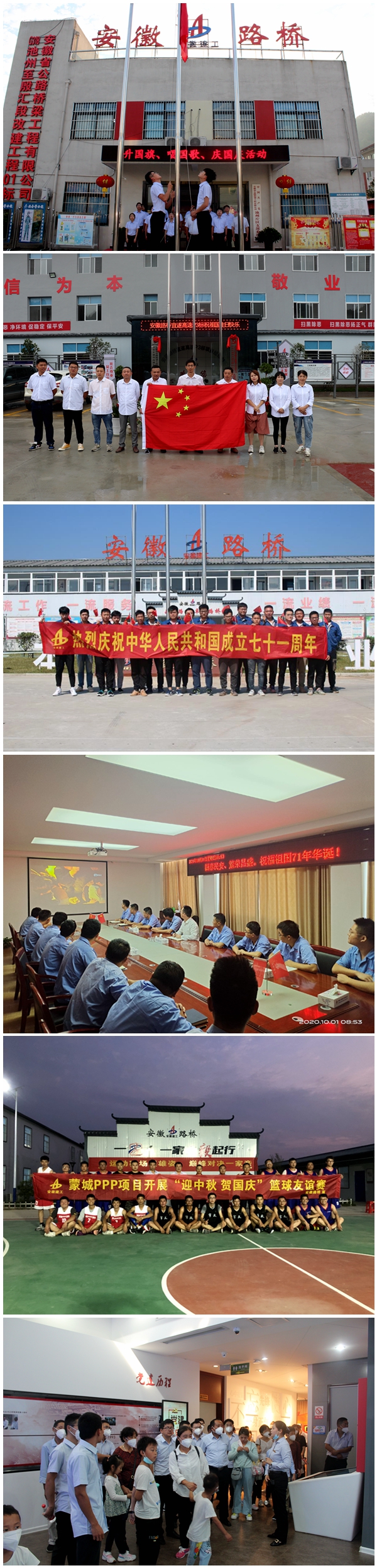 國(guó)慶前夕,市政分公司開(kāi)展“學(xué)習(xí)強(qiáng)國(guó)·一站到底”迎中秋慶國(guó)慶知識(shí)競(jìng)賽,以賽學(xué)史,吸引了來(lái)自十多個(gè)項(xiàng)目青年員工的積極參與。國(guó)慶當(dāng)日,福建漳州項(xiàng)目、陜西合陽(yáng)項(xiàng)目、江西宜遂高速P3標(biāo)、河南黃河特大橋項(xiàng)目、固蚌02標(biāo)、徽州大道等省內(nèi)外重點(diǎn)項(xiàng)目共同舉行“升國(guó)旗、唱國(guó)歌、慶國(guó)慶”主題活動(dòng),表達(dá)對(duì)祖國(guó)母親的祝福之情。明巢高速05標(biāo)、合肥軌道4號(hào)線(xiàn)01標(biāo)等項(xiàng)目黨支部組織全體員工集中觀看《我和我的祖國(guó)》《建國(guó)大業(yè)》《八佰》等愛(ài)國(guó)題材電影。鳳陽(yáng)ppp項(xiàng)目、廬江片區(qū)項(xiàng)目組織員工就近參觀愛(ài)國(guó)主題教育基地,接受一次深刻的理想信念和愛(ài)國(guó)主義教育。此外,池州G318改建工程、蒙城PPP、蕪黃高速等項(xiàng)目還結(jié)合“家文化”建設(shè),邀請(qǐng)職工家屬到項(xiàng)目部共慶佳節(jié)。