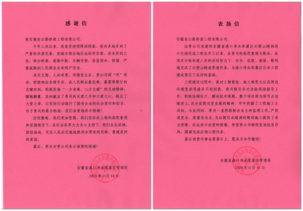 近日,由安徽路橋公司承建的宣城市寧國港口灣水庫灌區(qū)石壁山隧道進口交通改造工程獲安徽省港口灣水庫灌區(qū)管理局來信感謝,對公司在入汛時發(fā)揮國企擔當、積極抗洪搶險,安全、優(yōu)質、高效完成石壁山隧道進口交通改造任務表示感謝。