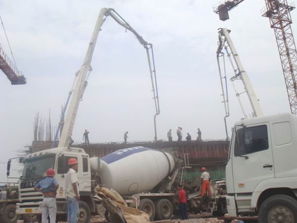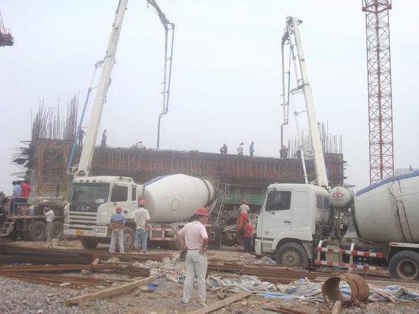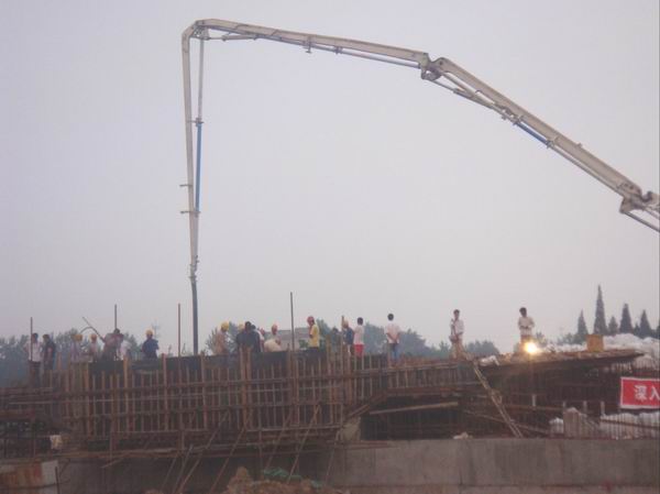 盛夏季節(jié),驕陽(yáng)似火。經(jīng)項(xiàng)目部科學(xué)組織、精心準(zhǔn)備、合理安排,2009年6月21日上午六安市淠望路大橋工地上人頭攢動(dòng)、機(jī)器轟鳴,兩臺(tái)混凝土泵車高高聳立在大橋主墩0#塊上面。九時(shí)許,經(jīng)現(xiàn)場(chǎng)監(jiān)理組和業(yè)主驗(yàn)收后,淠望路大橋主墩0#塊開(kāi)始澆注混凝土,現(xiàn)場(chǎng)施工人員克服高溫酷暑天氣,經(jīng)過(guò)個(gè)5個(gè)多小時(shí)的連續(xù)奮戰(zhàn),于當(dāng)天下午三點(diǎn)順利完成混凝土的澆筑工作。