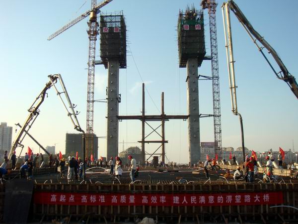 淠望路大橋主橋邊跨長(zhǎng)85m,砼方量約2800m³,鋼筋約120t。為緊緊抓住秋季黃金施工季節(jié),趕在冬季來(lái)臨之前完成更多的生產(chǎn)任務(wù)。項(xiàng)目部經(jīng)認(rèn)真研究、周密論證,決定將原計(jì)劃分兩次澆筑的85m邊跨改為一次性澆筑,方量之大在公司歷史上尚屬首次。命令一下,項(xiàng)目部群情激昂、精神振奮、上下一心、紛紛卯足了干勁、準(zhǔn)備大干一把。項(xiàng)目部管理人員全體出動(dòng)齊上陣,幫助工人穿拉鋼絞線(xiàn);人員組織、材料設(shè)備安排、質(zhì)量控制、施工力量組織、后勤保障等工作科學(xué)周密、井然有序的迅速落實(shí)到位。公司領(lǐng)導(dǎo)更是高度重視,專(zhuān)門(mén)為這次大方量砼澆筑在現(xiàn)場(chǎng)召開(kāi)了生產(chǎn)調(diào)度會(huì),副總經(jīng)理彭申凱、總經(jīng)理助理傅月斌、副總工程師崔林釗等親自到現(xiàn)場(chǎng)督戰(zhàn)。公司還緊急抽調(diào)了合肥市政項(xiàng)目和金桃大橋項(xiàng)目的精兵強(qiáng)將前來(lái)鼎力“助陣”。