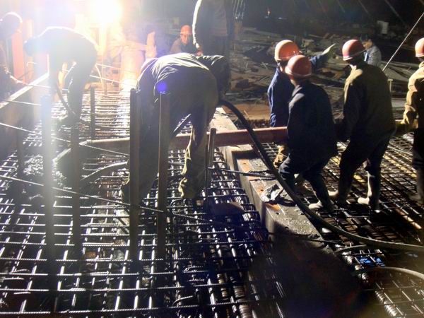淠望路大橋主橋全長120米,共有15個(gè)節(jié)段,是整個(gè)大橋的重難點(diǎn)和關(guān)鍵控制性工程,全部采用前支點(diǎn)掛籃施工。由于施工技術(shù)含量高、施工難度大,關(guān)系到全橋的進(jìn)度與形象,是全橋施工的重中之重。開工伊始項(xiàng)目部就高度重視,提出了“向主橋要進(jìn)度、向引橋要形象”的口號;多次組織專家評審施工方案、優(yōu)化施工工藝,特別是“塔梁并進(jìn)”工藝的采用,極大地促進(jìn)了工效,既縮短了工期又降低了成本。隨著工程的推進(jìn),項(xiàng)目部審時(shí)度勢的不斷優(yōu)化整合施工資源配置:在施工力量、機(jī)械設(shè)備上優(yōu)先滿足主橋施工需要。在搶時(shí)間趕進(jìn)度的同時(shí)不斷強(qiáng)化現(xiàn)場安全生產(chǎn)管理,并嚴(yán)把質(zhì)量關(guān),特別是會(huì)同監(jiān)控單位加強(qiáng)了對整橋線形控制,使之符合設(shè)計(jì)和施工技術(shù)規(guī)范要求,達(dá)到了預(yù)期效果。在工序無間隙、晝夜無間斷,質(zhì)量有控制、安全有保障的良好狀態(tài)下,以七至八天每節(jié)段的速度全力推進(jìn)主橋建設(shè),圓滿的完成了主橋建設(shè)的各項(xiàng)任務(wù)。