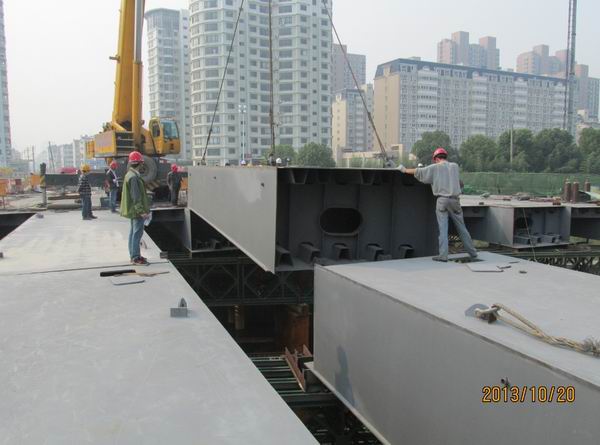 回顧跨南淝河橋鋼箱梁的施工過程,項(xiàng)目全體員工共同努力,克服了許多技術(shù)和吊裝難題。工程前期現(xiàn)場勘查發(fā)現(xiàn),橋梁東側(cè)位于現(xiàn)狀110kv高壓線下,河南岸的東側(cè)和西側(cè)分別有高壓鐵塔和污水泵站,大噸位吊車無法滿足安全施工條件。項(xiàng)目部技術(shù)人員根據(jù)橋型特點(diǎn)和場地特殊環(huán)境、設(shè)備要求, 上報(bào)設(shè)計(jì)單位將原設(shè)計(jì)20+30+20m三個(gè)制作段架設(shè)變更為16+10+18+10+16m五段架設(shè),并通過專家論證評(píng)審,解決了關(guān)于鋼箱梁架設(shè)存在的重要疑難。后期架設(shè)時(shí)為了確保吊裝100%安全,杜絕安全隱患,通過項(xiàng)目部與多方努力協(xié)調(diào),在10月20日架設(shè)東側(cè)110kv高壓線下鋼箱梁時(shí),高壓線暫停供電。全力做到放心安全的架好每一片梁。